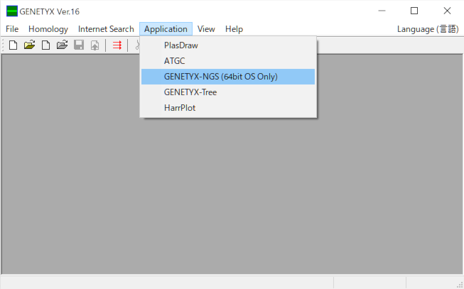 GENETYX の [Application] → [GENETYX-NGS(64bit OS Only)]を選択します。